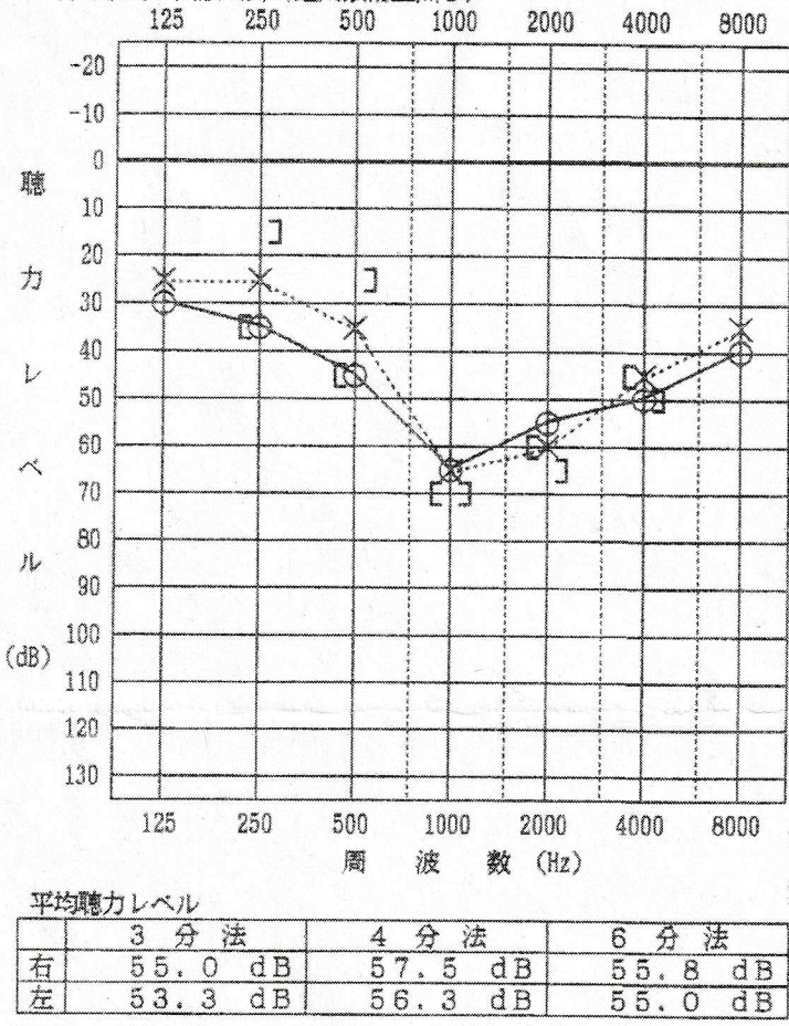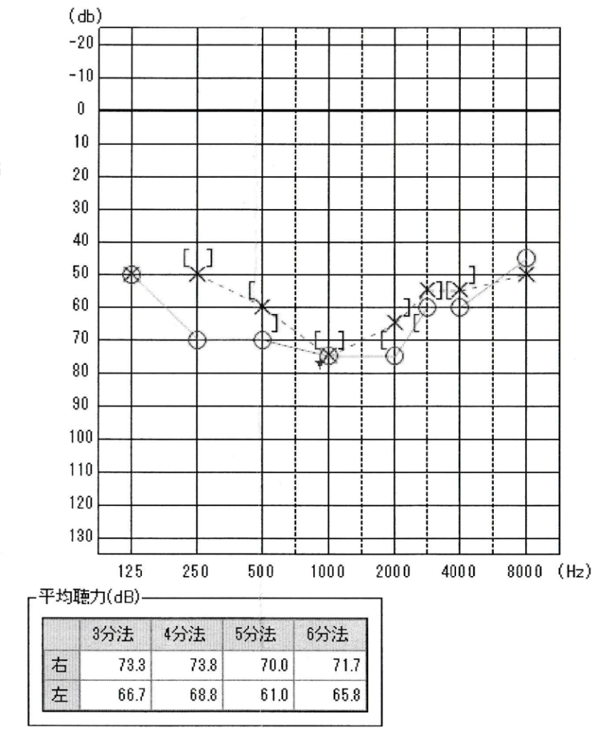 平均聴力は、4分法では右耳が73.8dB、左耳が68.8dB。